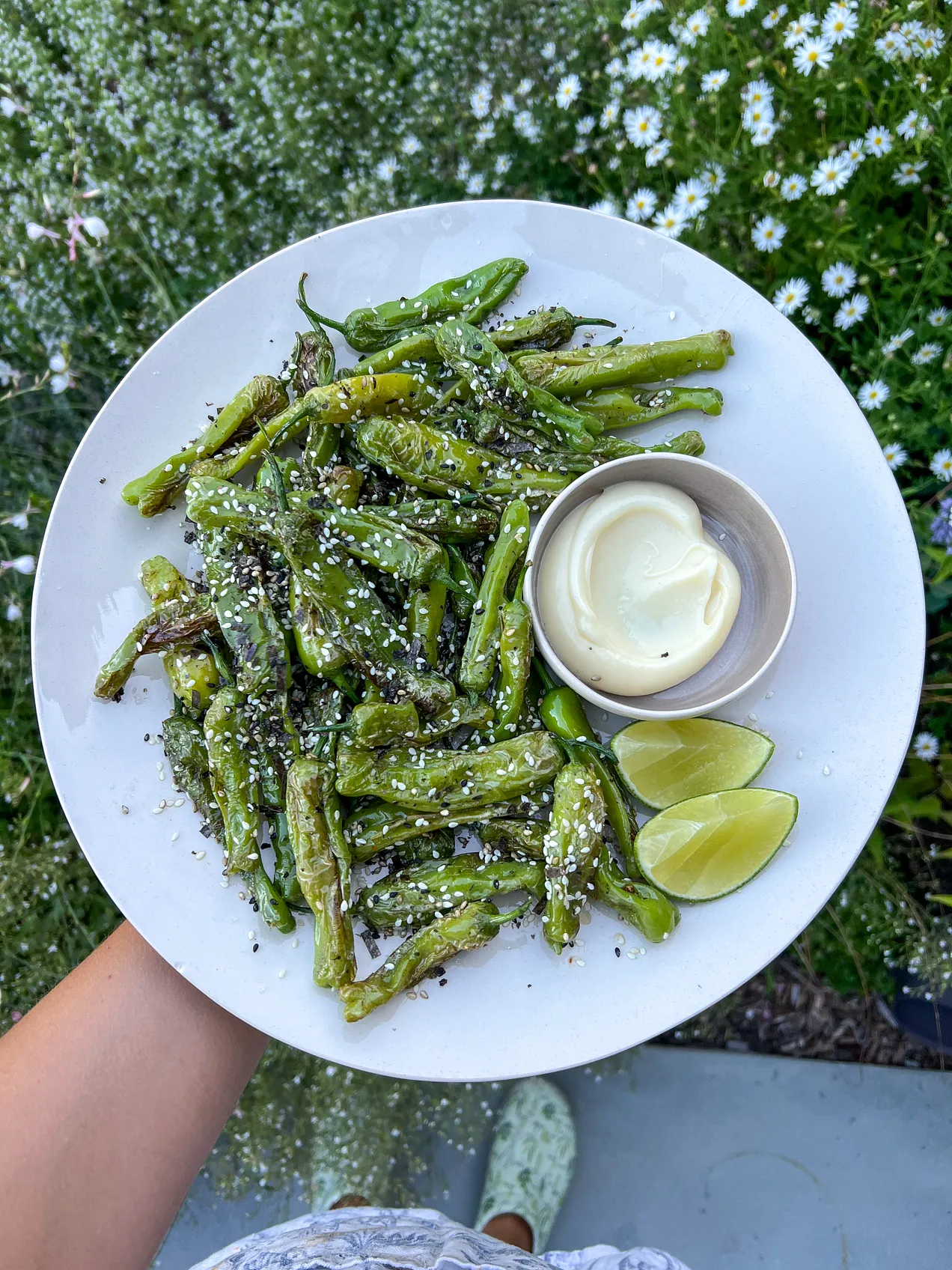 Blistered Shishitos with Togarashi and Yuzu Aioli